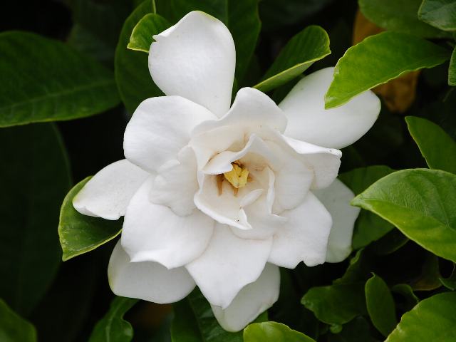 濃緑色の葉に映える香りのよい白い6弁花を咲かせる。