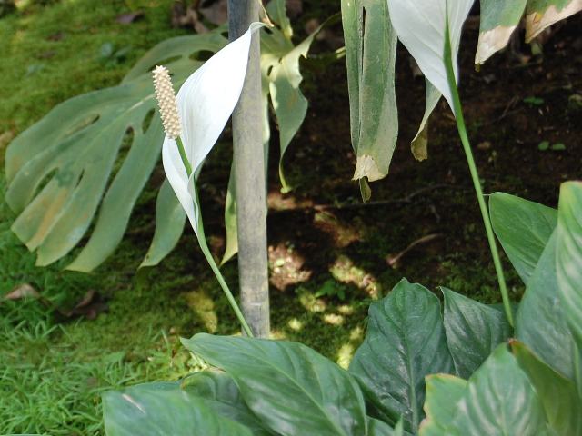 白い仏炎苞と鮮やかな緑色の葉の色合いが美しく涼しげで