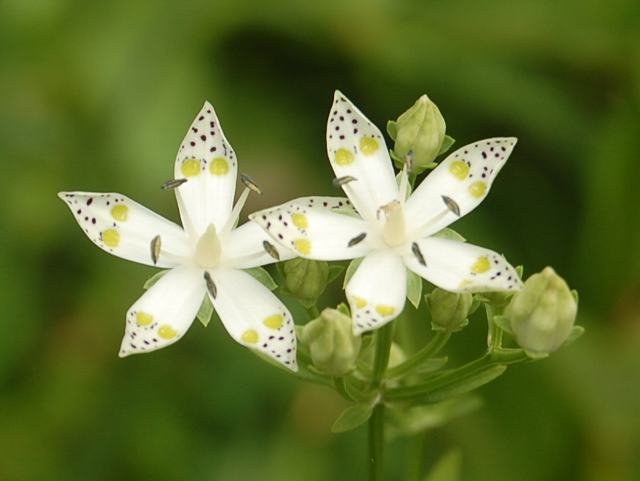 花の色は淡い紫色ないし白で、横向きないし下向きに小さな花をつける。