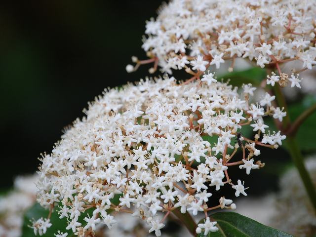 葉の脇から散形花序(枝先に1個つずつ花がつく)を出し、小さな白い花を10輪くらいつける。
