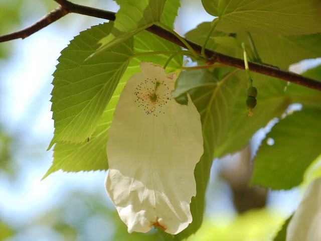 白いハンカチのように見えるのは2枚の苞(葉の変形したもの)である。