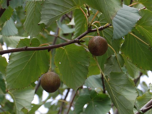 花の後にできる実は緑色の球状のさく果(熟すると下部が裂け、種子が散布される果実)で先が尖り、剛毛が生える。