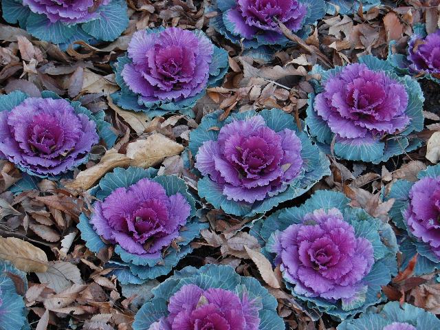 花の少ない冬花壇を賑やかな葉の色で咲く葉牡丹は、貴重な存在。